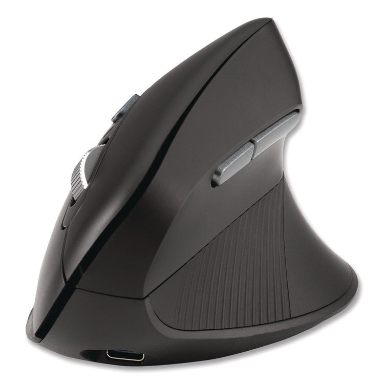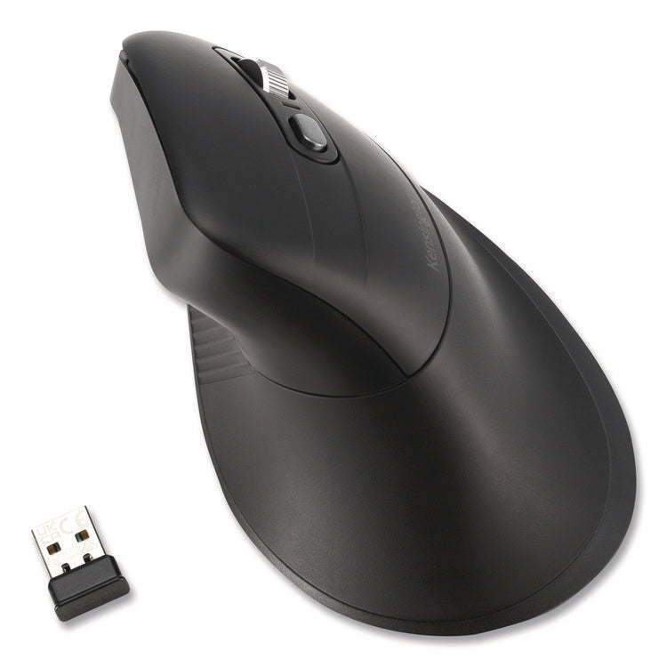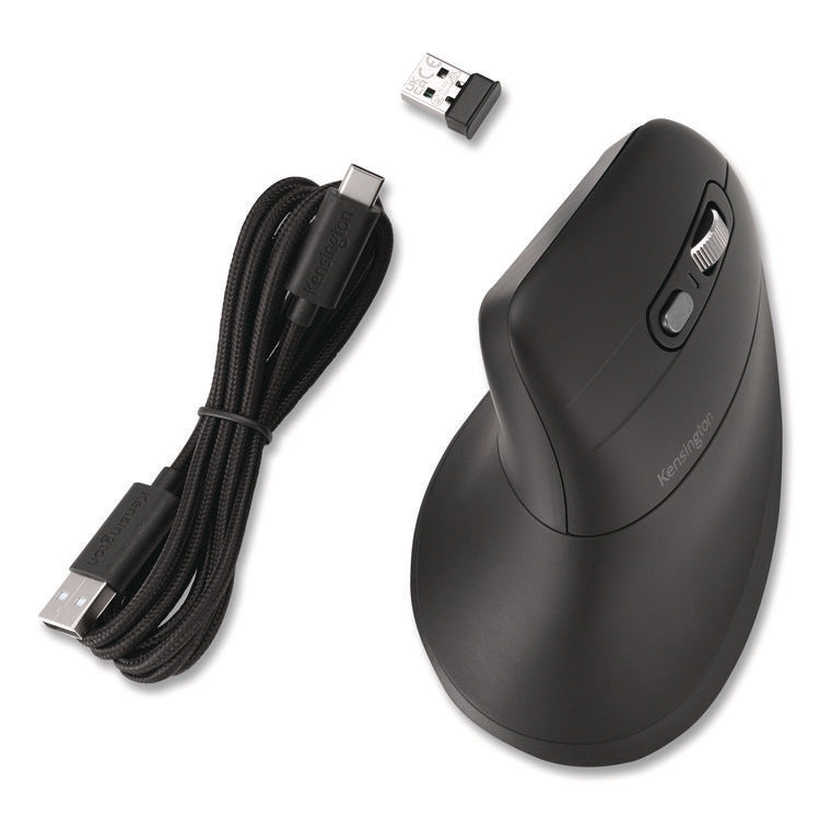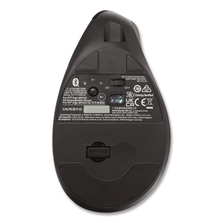 The Pro Fit® Ergo MY630 EQ Rechargeable Mouse is the ideal companion for busy professionals seeking a more sustainable solution delivering enhanced comfort and productivity. The vertical full-size design promotes improved wrist posture, ensuring all-day comfort and providing enhanced control for increased productivity. With its seamless multi-device connectivity, one via 2.4 GHz USB-A receiver and two via Bluetooth® LE, 5-programmable buttons, quiet clicking, high-definition optical sensor with three DPI settings (1000/1600/2400), convenient dongle storage, rechargeable battery, and 128-bit AES government-grade encryption security, MY630 sets a new standard for productivity. Free KensingtonWorks™ software provides additional productivity-enhancing customization options. Connector/Port/Interface: Bluetooth®; USB-A; Left/Right Hand Use: Right; Mouse Technology: Optical; Wired/Wireless: Wireless.