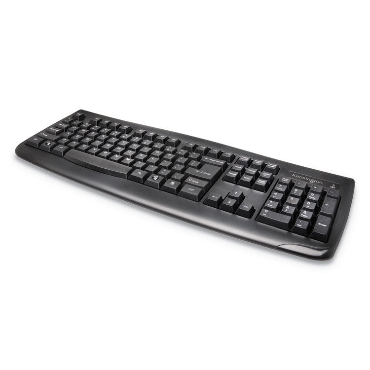 Spill-proof Pro Fit Wireless Keyboard features a thin sealed membrane that repels water and other liquids, keeping the wiring safe. The keyboard is full-size with 6 rows and includes a numeric keypad, giving the touch typist a professional experience for enhanced productivity. With a 2.4 GHz nano receiver, your desktop stays uncluttered since there's no wiring to get in your way, plus you gain the freedom to easily take your keyboard on the go if needed. With Plug & Play installation, simply insert the receiver into your device and you'll be typing in no time. Compatible with Windows®. Wired/Wireless: Wireless; Maximum Wireless Range: 30 ft; Connector/Port/Interface: USB; For Device Type: Desktop.