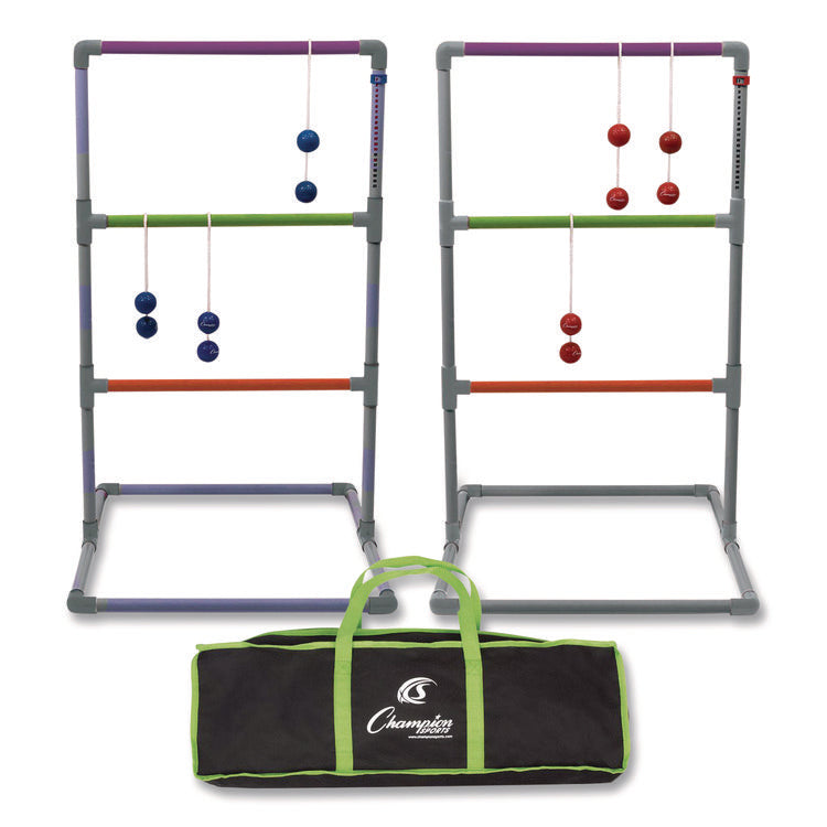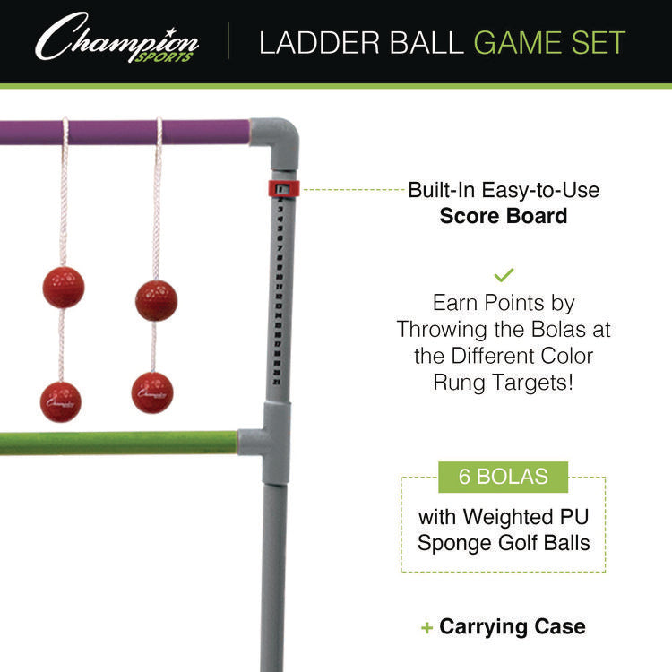 Earn points by throwing bolas at different color rung targets with the Champion Sports Ladder Golf Set. The ladder game set only takes minutes to set up and provides hours of fun at the beach, park, or your backyard. This set includes two plastic ladders with a deep base for stability, and six bolas (two weighted sponge golf balls connected by a string). Earn points by throwing the bolas at the different color rung targets! Length: 37.5"; Width: 22"; Material(s): Plastic; Playground/Gymnasium Sets Type: Ladder Ball Game Set.