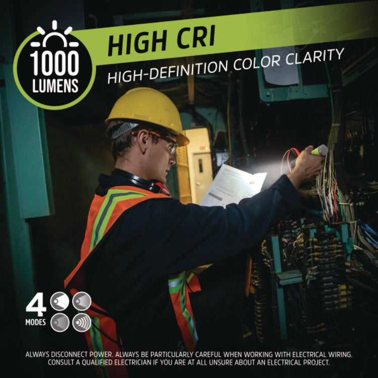 Energizer Hybrid Pro Series Handheld High CRI Flashlight maximizes your performance and durability to meet the tough standards and demands of your job. This handheld flashlight features powerful LED technology with High CRI for high-definition color clarity to enhance your safety with increased visibility. You can power up this hybrid flashlight with 6 AAA batteries (included) or recharge via USB (charging cable included). With 1,000 lumens, this LED light offers intense lighting and has a beam distance spanning nearly 1.5 stadium fields. Durable, waterproof and dustproof, this flashlight withstands demanding conditions. The anti-roll design and magnet attachment provide a steady base for hands-free operation or storage. It also features a large push-button switch that is easy to use with gloves on and a non-slip grip for easy carry. Plus, a pouch is included to attach to your belt while easily storing your light, batteries, cartridges and charging cable all in one place. The green color lets you easily find this bright flashlight in your toolbox. It's recommended to use this durable LED flashlight in emergency situations or as a work flashlight. Trust in Energizer to deliver the powerful performance we promise Energizer lights are tested and adhere to strict, reliable ANSI standards. Battery Type: Alkaline; Lithium Ion; Flashlights Type: LED; Power Source(s): Rechargeable Lithium Ion (Included); 6 AAA Batteries (Included); Voltage: 4.2 V.