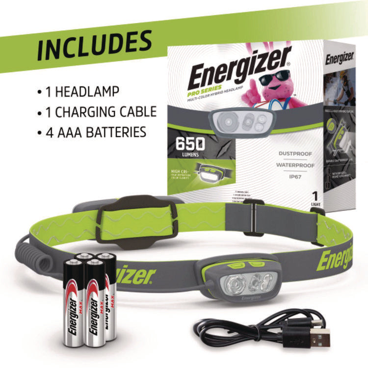 Energizer Pro Series Multi-color Hybrid Headlamp offers convenient hands-free operation that is 12x brighter than standard LED technology. This work headlamp illuminates 650 lumens and spans the length of a stadium field. Seven modes, including high, medium, low, green, red and red flashing, let you choose the right setting for any job, and the advanced dimming feature lets you adjust the intensity of the light between 10% and 100%. Red and green LED modes allow you to preserve night vision, and high CRI LED offers clear color definition. Battery Type: Alkaline; Lithium Ion; Flashlights Type: Headlamp; Power Source(s): 4 AAA (Included); Rechargeable Lithium Ion (Included); Voltage: 4.2 V.