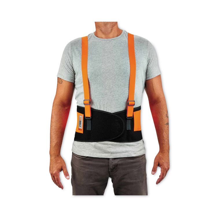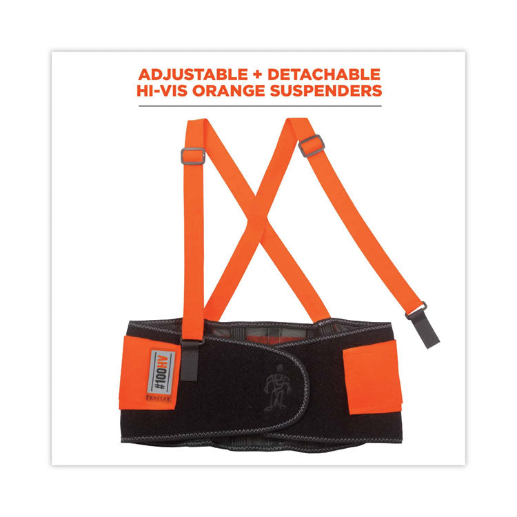 The ProFlex 100HV Economy Hi-Vis Spandex Back Support Brace is designed to remind workers of proper lifting techniques, while enhancing the body's intra-abdominal pressure to move stress away from the spine to minimize the potential for back-pain. Hi-vis orange panels help keep workers conspicuously visible. Durable, yet economic 280D spandex body is as comfortable as it is supportive. Ultra-flexible, stretchable bias binding features zig-zag stitching for enhanced strength. Before lifting heavy objects, simply tighten the support belt to enhance the body's intra-abdominal pressure; and after lifting, just loosen the belt to achieve a wider range of motion. Innovative Power Panel Positioners keep the tension bands close-to-hand, making it easy to get the desired level of tension. Secure-fit, interior rubber-track webbing prevents the belt from riding up when bending or lifting. Non-conductive polypropylene stays help ensure long-lasting integrity. Adjustable, removable shoulder straps keep the belt on standby until the next lift while allowing the wearer to tailor the shoulder-fit to his or her unique needs. For best results, the support should fit snugly around the wearer's hips, with the front of the support two-fingers below the wearer's navel. When worn correctly, workers can easily maintain the proper posture for lifting, while achieving the extra support required to safely complete the task. Easy-to-use hook-and-loop closure keeps the belt securely fastened while in use. Brace can be worn over or underneath clothing. Machine washable—machine-wash cold and air dry. General Category: Work/Safety Gear; Sub-Category: Work Harness; Color(s): Black/Orange; Color Family: Multicolor.