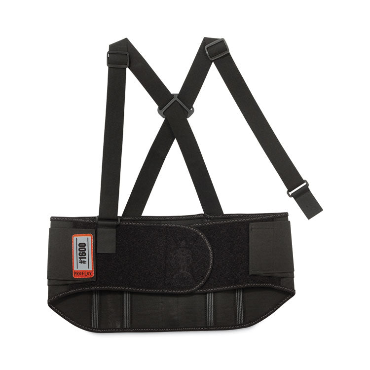 The ProFlex 1600 Standard Elastic Back Support Brace is designed to remind workers of proper lifting techniques while also enhancing the body's intra-abdominal pressure, moving the stress away from the spine for back-pain relief. Premium, all-elastic body with a 9 wide belt provides extra-firm support, and a contoured, high-cut front panel delivers a more comfortable fit. Before lifting heavy objects, simply tighten the support belt to enhance the body's intra-abdominal pressure; and after lifting, just loosen the belt to achieve a wider range of motion. Secure-fit, interior rubber-track webbing prevents the belt from riding up when bending or lifting. Innovative Power Panel Positioners keep the tension bands close-to-hand, making it easy to get the desired level of tension. Non-conductive polypropylene stays help ensure long-lasting integrity. Adjustable, detachable suspenders allow the wearer to tailor the shoulder-fit to his or her unique needs. For best results, the support should fit snugly around the wearer's hips, with the front of the support two-fingers below the wearer's navel. When worn correctly, workers can easily maintain the proper posture for lifting, while achieving the extra support required to safely complete the task. Easy-to-use hook-and-loop closure keeps the belt securely fastened while in use. Brace can be worn over or underneath clothing. Machine washable—machine-wash cold and air dry. General Category: Work/Safety Gear; Sub-Category: Work Harness; Color(s): Black; Color Family: Black.