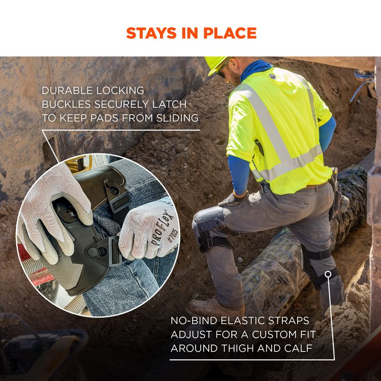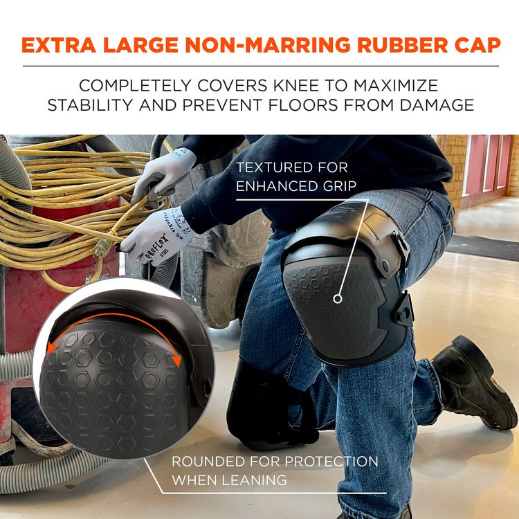 The ProFlex 360 Hard Shell Hinged Knee Pads feature an ergonomic hinge design that is built to keep protection comfortably in place whether walking, crawling or kneeling. The combination of a heavy-duty hard shell with a soft non-marring cap makes these pads versatile for protection on any indoor or outdoor surface-no matter how abrasive or delicate. Unlike other knee pads of this style on the market, the free-moving hinge design enables smooth and full 180-degree extension of the pad when straightening the knee. Thick closed-cell foam padding provides supportive all-day comfort, while the extra-large rubber cap maximizes surface area to increase stability and minimize risk of scratching or marking flooring such as tile or linoleum. Wide elastic straps easily adjust for a custom fit on a variety of leg sizes, and are designed to sit further apart on the thigh and calf to prevent uncomfortable binding. Elbow/Knee Pad Type: Knee; Size Group: One Size Fits Most; Closure Type: Buckle; Material(s): Foam; Polypropylene.