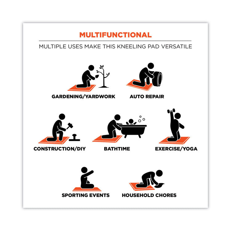 The ProFlex 380 Standard Kneeling Pad provides cushioning comfort and knee protection for static kneeling situations. This kneeling mat is made with thick nitrile rubber (NBR) closed cell foam which will keep its shape over time and won't absorb liquids. The durable closed-cell foam is non-conductive, resistant to petroleum and silicone-free. A convenient built-in handle allows for easy transport and hanging storage, making it the perfect knee cushion for work on the job site, in the garage, the garden or at home. Designed for kneeling on cold surfaces, hard steel, concrete, grating, gravel and wet surfaces. Ideal for mechanics, construction, plumbers, electricians, flooring or anyone looking for comfortable knee support without having to strap on work knee pads. Also great as a garden kneeler or for work around the house. Helps protect against common knee injuries on the job by supporting knees and joints. Elbow/Knee Pad Type: Knee; Impact Resistance: Petroleum; Water; Size Group: Medium; Material(s): NBR Foam.