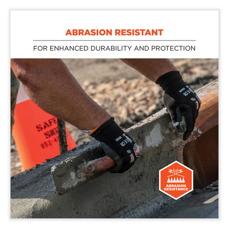 The ProFlex 7001 Nitrile Coated Gloves feature a durable DSX coating for optimal grip and dexterity in dry conditions. The 18-gauge nylon-spandex knit makes for a soft, lightweight and flexible form fit while still meeting ANSI Level 3 Abrasion Resistance for safety around rough materials. Ideal for handling small parts, the combination of DSX coating and thin form-fitting knit delivers enhanced dexterity compared to bulkier safety gloves. The snug knit cuffs are longer than most on the market, a feature that enhances fit and extends protection while keeping dirt and debris out. Coated in two-layer DSX nitrile, (D)ry (S)urface E(X)treme, these utility work gloves are designed for optimal performance when handling dry materials and surfaces. The double layers of smooth abrasion-resistant nitrile boost glove durability and feel while remaining comfortably flexible for enhanced dexterity with minimal hand fatigue. Glove Style: Coated; Wrist Style: Knit Cuff; Material(s): DSX Nitrile; Nylon-Spandex Knit; Thumb Style: Straight.