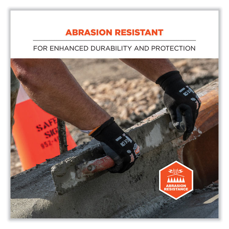 The ProFlex 7001 Nitrile Coated Gloves feature a durable DSX coating for optimal grip and dexterity in dry conditions. The 18-gauge nylon-spandex knit makes for a soft, lightweight and flexible form fit while still meeting ANSI Level 3 Abrasion Resistance for safety around rough materials. Ideal for handling small parts, the combination of DSX coating and thin form-fitting knit delivers enhanced dexterity compared to bulkier safety gloves. The snug knit cuffs are longer than most on the market, a feature that enhances fit and extends protection while keeping dirt and debris out. Coated in two-layer DSX nitrile, (D)ry (S)urface E(X)treme, these utility work gloves are designed for optimal performance when handling dry materials and surfaces. The double layers of smooth abrasion-resistant nitrile boost glove durability and feel while remaining comfortably flexible for enhanced dexterity with minimal hand fatigue. Glove Style: Coated; Wrist Style: Knit Cuff; Material(s): DSX Nitrile; Nylon-Spandex Knit; Thumb Style: Straight.