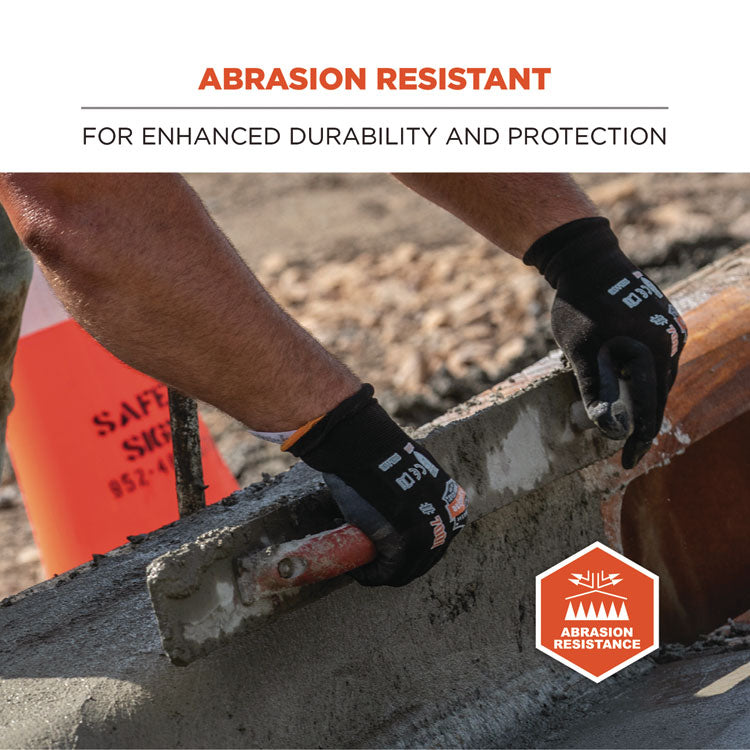 The ProFlex 7001 Nitrile Coated Gloves feature a durable DSX coating for optimal grip and dexterity in dry conditions. The 18-gauge nylon-spandex knit makes for a soft, lightweight and flexible form fit while still meeting ANSI Level 3 Abrasion Resistance for safety around rough materials. Ideal for handling small parts, the combination of DSX coating and thin form-fitting knit delivers enhanced dexterity compared to bulkier safety gloves. The snug knit cuffs are longer than most on the market, a feature that enhances fit and extends protection while keeping dirt and debris out. Coated in two-layer DSX nitrile, (D)ry (S)urface E(X)treme, these utility work gloves are designed for optimal performance when handling dry materials and surfaces. The double layers of smooth abrasion-resistant nitrile boost glove durability and feel while remaining comfortably flexible for enhanced dexterity with minimal hand fatigue. Glove Style: Coated; Wrist Style: Knit Cuff; Material(s): DSX Nitrile; Nylon-Spandex Knit; Thumb Style: Straight.