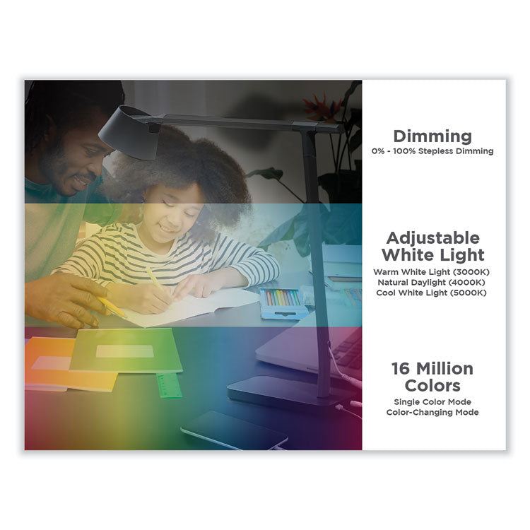 Durable, sleek, and carefully crafted with anodized aluminum beams for premium strength and durability. Brilliant design meets convenient control with our BLACK+DECKER Designer Desk Lamp with Wireless Charging that seamlessly brings light to your workspace with three touch-capacitive buttons that allow easy dimming and color adjustment. Boasting a modern design, this lamp is ideal for tables, desks, nightstands, and other areas in the home or office. With three points of adjustability on the lamp, its design has been crafted for ultimate customization, no matter where you need light. This lamp also acts as a fast and convenient power station for your phone, tablet and any other devices that need a bit of charging with a base that features a Qi wireless charging pad. You can easily set the scene for any occasion with true white lighting or unwind to a spectrum of 16 million colors. Base Color: Black; Plug Type: 2 Prong; Height: 17.32"; Width: 4.72".