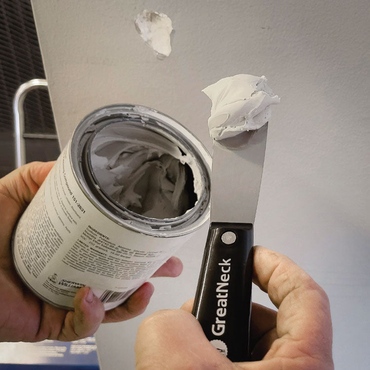 1.25" Stiff putty knife. Black plastic handle. Blade Width: 1.25"; Blade Material: Steel; Handle Material(s): Plastic; Handle Color: Black.