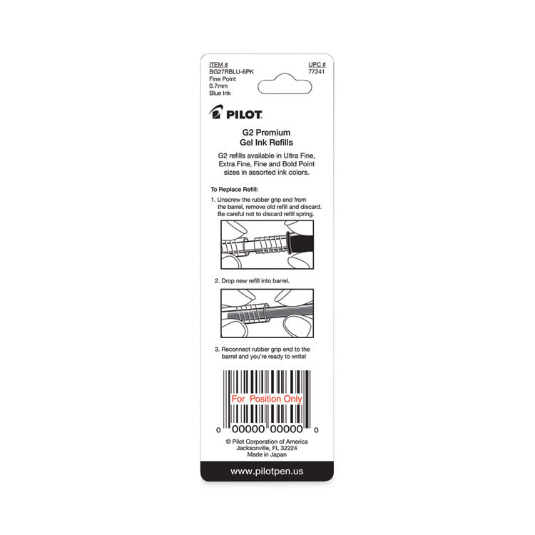 Delivers quick-drying, water-resistant and smear-free results. Patented, advanced liquid ink technology formulation offers a consistent, smooth flowing write. Trust Pilot® for premium quality performance. For Q7, G2, G2 Limited, G2 Pro, G2 Fashion, G6, Precise Gel BeGreen, Dr Grip LTD, Dr Grip Gel, B2P Gel, G-Knock and MR Metropolitan Gel Rollers. Refill Format: Standard Gel; Refill For Series: Pilot® B2P Gel Pens, Dr Grip® Gel Pens, Dr Grip® LTD Gel Pens, G2 Fashion Gel Pens, G2 Gel Pens, G2 Limited Gel Pens, G2 Pro Gel Pens, G6 Gel Pens, MR Metropolitan Gel Pens, Precise Gel BeGreen® Pens, Q7 Gel Pens; Refill Ink Color: Blue; Color Family: Blue.