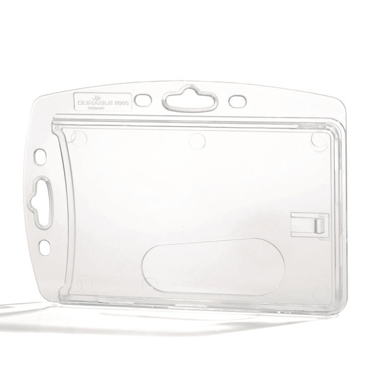 The single-card replacement card holders from DURABLE® are designed to keep one ID card secure and visible. The high-quality material is resistant to wear and tear, ensuring that your badge holder remains in excellent condition even with frequent use. Designed to withstand extreme weather conditions, the badge holder is UV-resistant, cold-crack-resistant down to -4° F, and features a watertight zip-locked enclosure to guard against water damage. This durability is essential for environments where ID cards are exposed to various climates. Whether in construction, manufacturing, or other demanding fields, this card holder stands as a trustworthy companion, prioritizing both functionality and user convenience. Orientation: Horizontal/Vertical; Name Badge Holder Length: 2.13"; Name Badge Holder Width: 3.38"; Name Badge Holder Color(s): Clear.