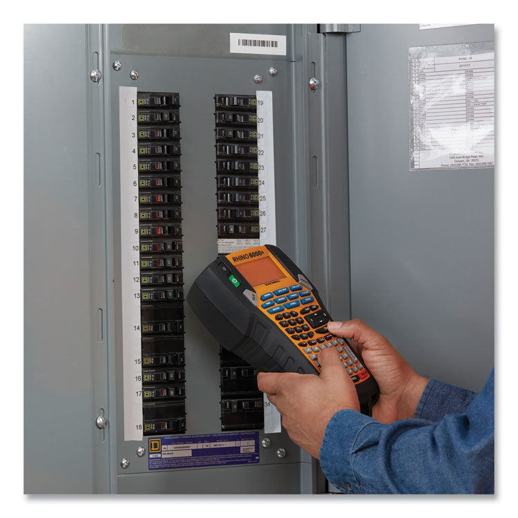 Packed with time-saving hot keys and shortcuts, the DYMO Rhino Industrial 6000+ Label Maker lets you quickly print approved industrial labels for electrical wiring, patch panels, terminal and 110 blocks, cable flags, and other industrial applications. The label maker also works with Rhino Connect software, a powerful labeling solution that lets you create templates and download them to your labeler for fast on-site labeling. Power Source(s): Rechargeable Lithium Ion Battery; Tape Size: 0.25"; 0.38"; 0.5"; 0.75"; 1"; Maximum Tape/Label Width: 1"; Number of Printed Lines: 5.