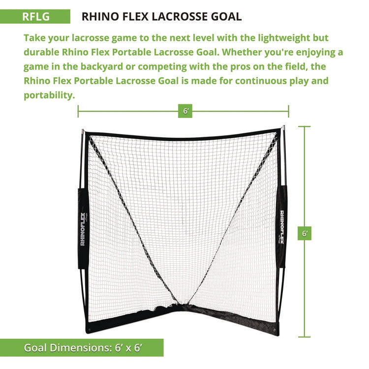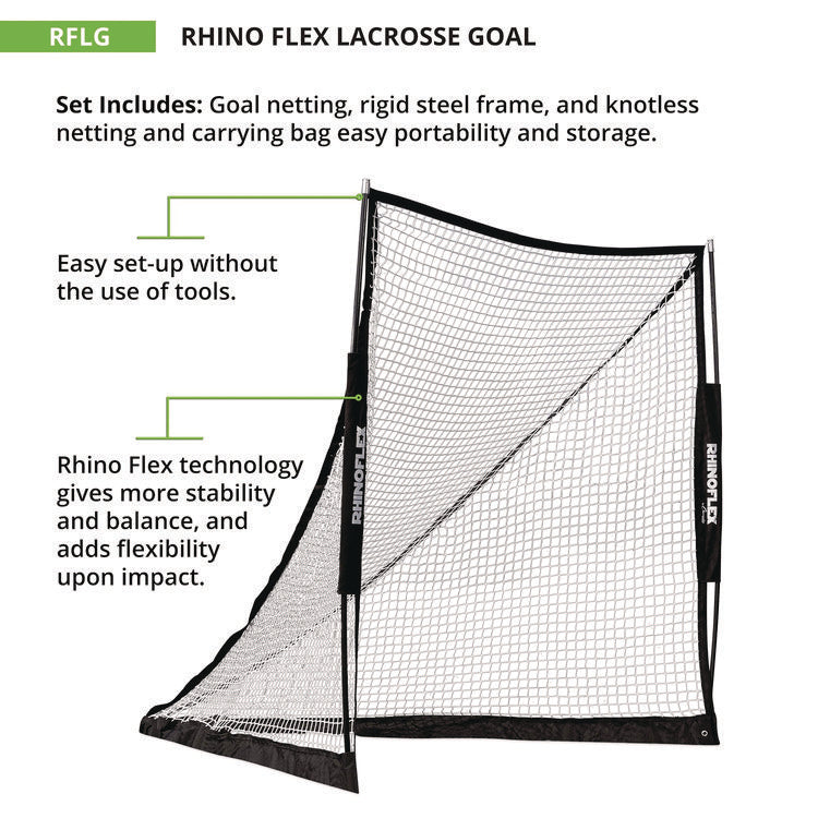 Take your lacrosse game to the next level with the lightweight but durable Rhino® Flex Portable Lacrosse Goal. Whether you're enjoying a game in the backyard or competing with the pros on the field, the Rhino® Flex Portable Lacrosse Goal is made for continuous play and portability. The Rhino® Flex technology gives more stability and balance to the net, adding flex action upon impact! Use it as a backstop, barrier net or for field division. The Rhino® Flex also is easy to set-up and take down, without the use of tools. The goal includes a convenient travel bag for easy portability and storage. Length: 6 ft; Width: 6 ft; Diameter: 1"; Material(s): Fiberglass; Net; Steel.