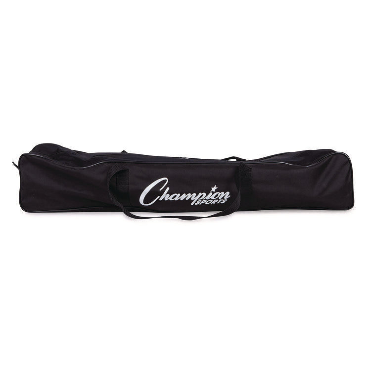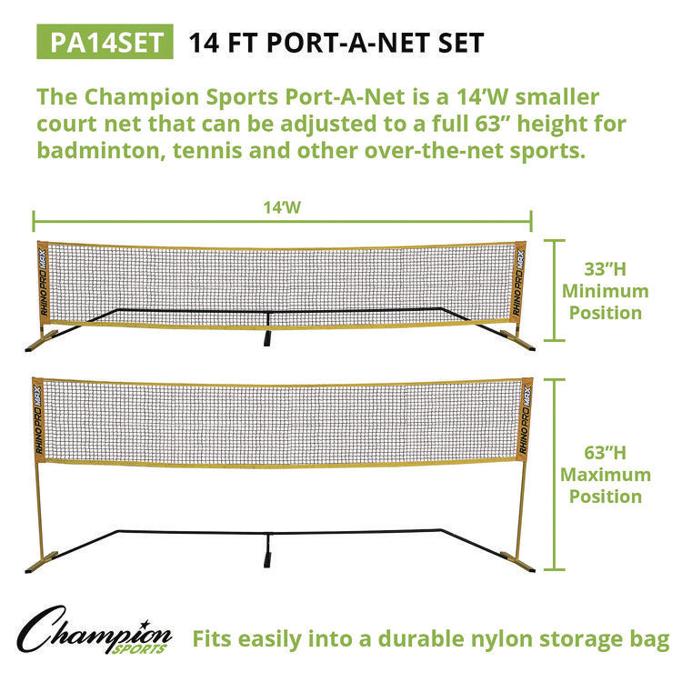 The Champion Sports Rhino® Port-A-Net is a regulation portable net system that allows you to set up a full-size court wherever and whenever you need it. The durable powder coated oval steel frame requires no extra weight for stability. The entire portable system fits easily into a durable nylon carry bag for convenient storage and transport. Length: 36" to 60"; Width: 168"; Diameter: 1"; Material(s): Steel; Nylon.