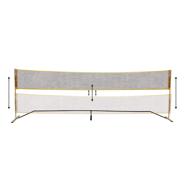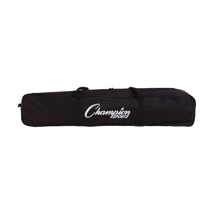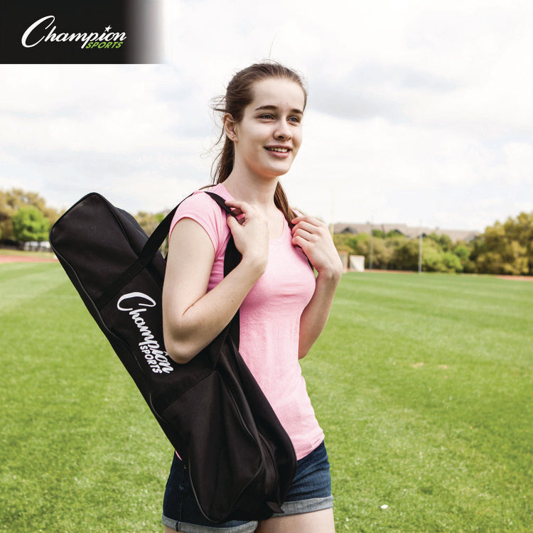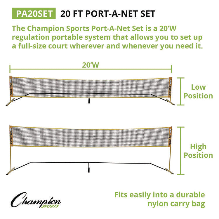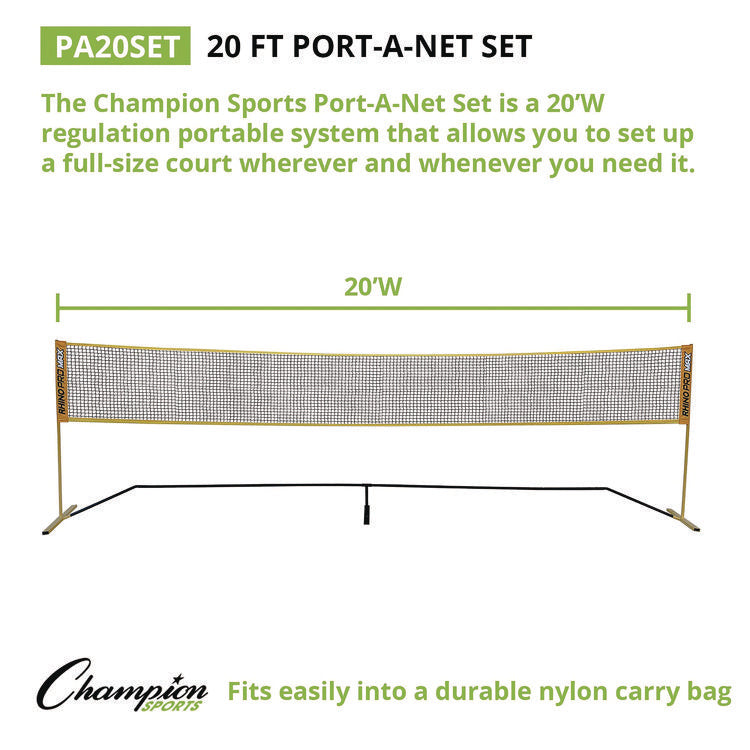 The Champion Sports Rhino® Port-A-Net is a regulation portable net system that allows you to set up a full-size court wherever and whenever you need it. The durable powder coated oval steel frame requires no extra weight for stability. The entire portable system fits easily into a durable nylon carry bag for convenient storage and transport. Length: 36" to 60"; Width: 240"; Material(s): Steel; Nylon; Playground/Gymnasium Sets Type: Port-A-Net Set.