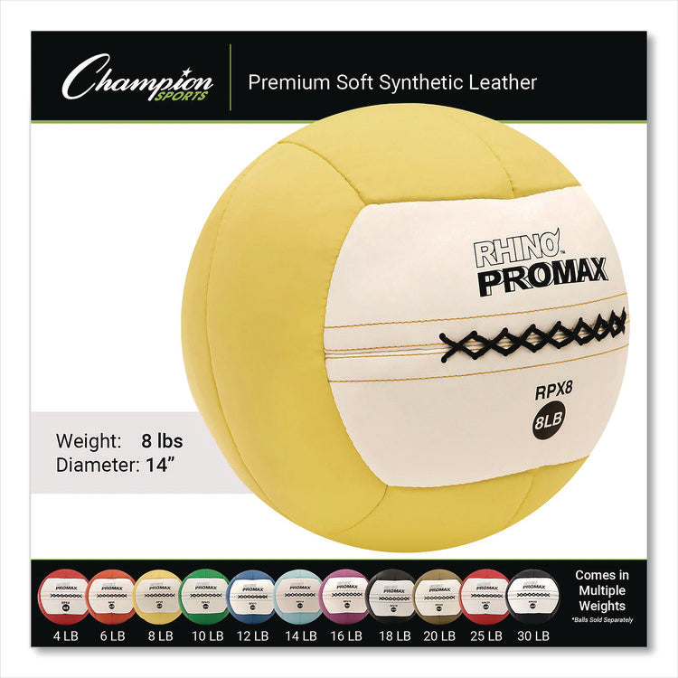 Get an intense workout with the Champion Sports Rhino® Promax Medicine Ball. Use it for throwing, catching and more while exercising to improve strength and cardio. This softshell medicine ball features a synthetic leather cover for added comfort and grip. The Rhino® Skin shell offers exceptional durability to withstand extreme workout routines without ever losing its shape or weight balance. 8 lb. Diameter: 14"; Material(s): Synthetic Leather; Color(s): Yellow.
