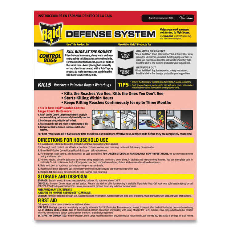 Raid Double Control Roach Baits kill the roaches you see as well as the ones you don't see with two types of bait. After roaches feed on the bait, they return to the nest and transfer the bait to the others. Population reduction and less activity can be expected within days, with the baits working continuously for up to three months. Raid Double Control Roach Baits are child-resistant. Read label before use. Use only as directed. Physical Form: Paste; Application: Pest Control; Pest Type: Roaches; Volume Capacity: 0.7 oz.