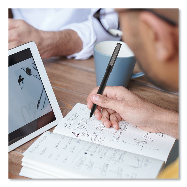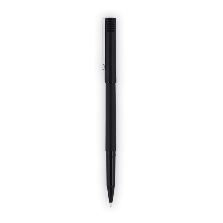 Stock your office, home or classroom with Roller Rollerball Stick Pens from uni-ball featuring strong, long lasting tips. These rollerball pens deliver the silky-smooth glide of a fountain pen without smudging for effortless writing. Roller pens produce neat and precise lines for intricate writing, making it easy to create super fine details in your drawings and diagrams. Capped roller pens are useful for a variety of tasks from note taking to signing checks and legal documents to uniquely embellishing fun and creative writing projects. Innovative uni Super Ink technology forms a strong bond with the paper, protecting from water, fading and fraud. Made from recycled material. Pen Type: Rollerball Pen; Pen Style: Stick; Pen Tip Type: Conical; Pen Point Size Type: Extra-Fine.