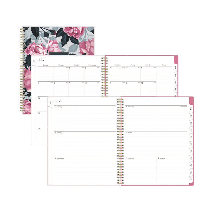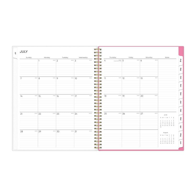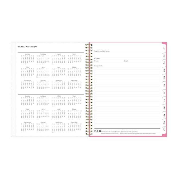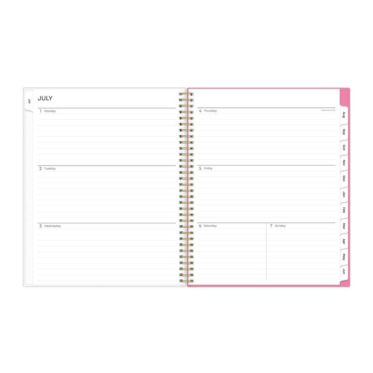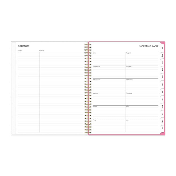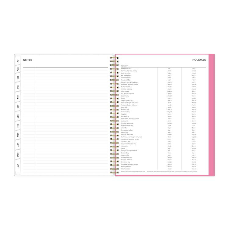 Give your schedule a fresh start and bring order to your busy life. The sophisticated Roosevelt Pink planner's cover features a soft floral motif that can help inspire you as you plan for a successful school year. Weekly spreads deliver flexibility with an open-scheduling format running from Monday through Sunday. Tabbed monthly spreads provide a familiar layout with a separate notes section for important projects. Two bonus past monthly spreads for May and June help make yearly transitions easy. Additional resources include pages to work out your goals, keep your contacts handy, take plenty of notes and more. Flexible, frosted front cover is made to withstand heavy use all year long, twin-wire binding offers easy page turning and thick, premium-quality pages reduce ink bleed-through. Dated/Undated: Dated; Calendar Format: Weekly; Monthly; Calendar Spread Format: One Week per Two-Page Spread; One Month per Two-Page Spread; Edition Year: 2024 to 2025.