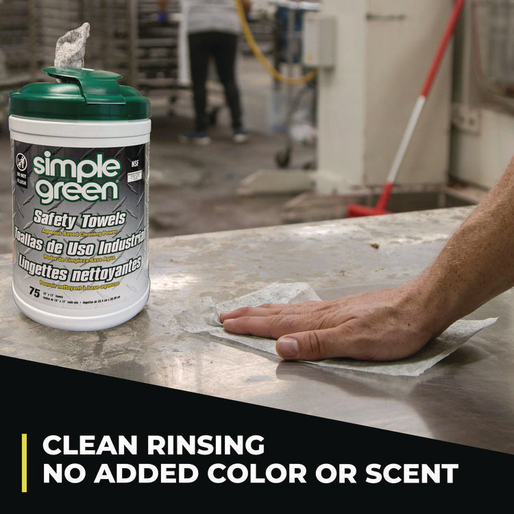 Simple Green Safety Towels are large-sized wipes for heavy-duty, multi-purpose cleaning. Each wipe is saturated with Crystal Simple Green, a powerful cleaner and degreaser. The durable, dual-sided wipes feature a scouring side for tough scrubbing and a smooth side for a non-abrasive shine. Easily remove dirt, grease, grime, oil, food spills, wet paint, carbon, graphite, tar, soot, and most inks. These wipes are safe for use on all washable surfaces including metals, concrete, rubber, finished wood, tile, laminates, concrete, stone, porcelain, carpet, and other industrial surfaces. Formula contains no added color or scent, and is NSF registered for use in food processing facilities and commercial kitchens. Towel/Wipe Type: Cleaner/Detergent Wet Wipe; Application: General Purpose; Material(s): Polypropylene; Number of Plies: 1.