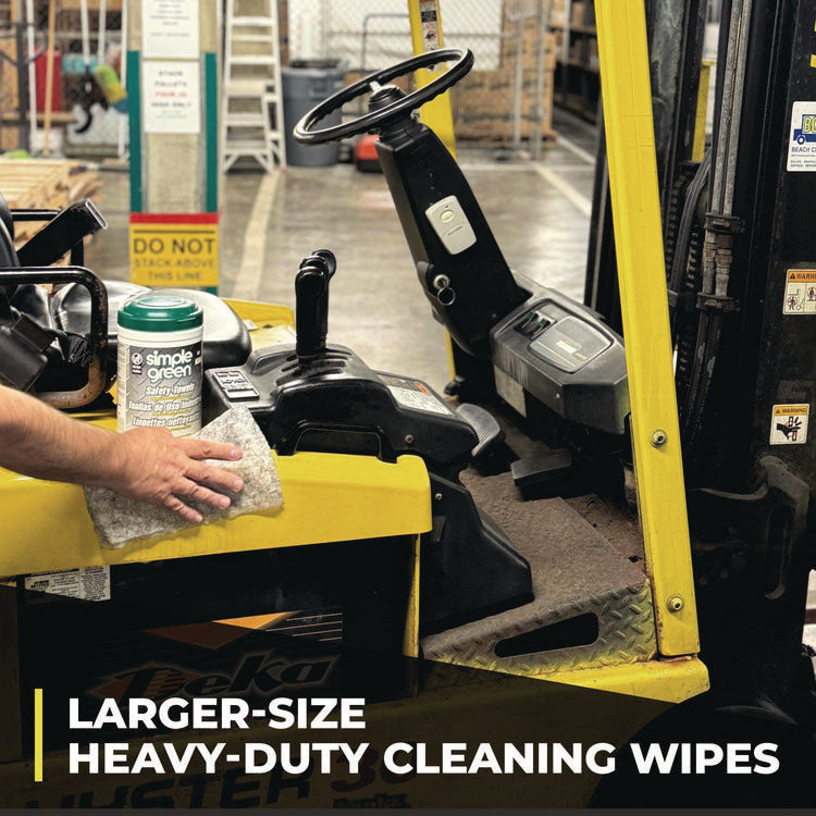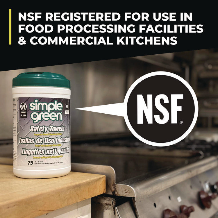 Simple Green Safety Towels are large-sized wipes for heavy-duty, multi-purpose cleaning. Each wipe is saturated with Crystal Simple Green, a powerful cleaner and degreaser. The durable, dual-sided wipes feature a scouring side for tough scrubbing and a smooth side for a non-abrasive shine. Easily remove dirt, grease, grime, oil, food spills, wet paint, carbon, graphite, tar, soot, and most inks. These wipes are safe for use on all washable surfaces including metals, concrete, rubber, finished wood, tile, laminates, concrete, stone, porcelain, carpet, and other industrial surfaces. Formula contains no added color or scent, and is NSF registered for use in food processing facilities and commercial kitchens. Towel/Wipe Type: Cleaner/Detergent Wet Wipe; Application: General Purpose; Material(s): Polypropylene; Number of Plies: 1.