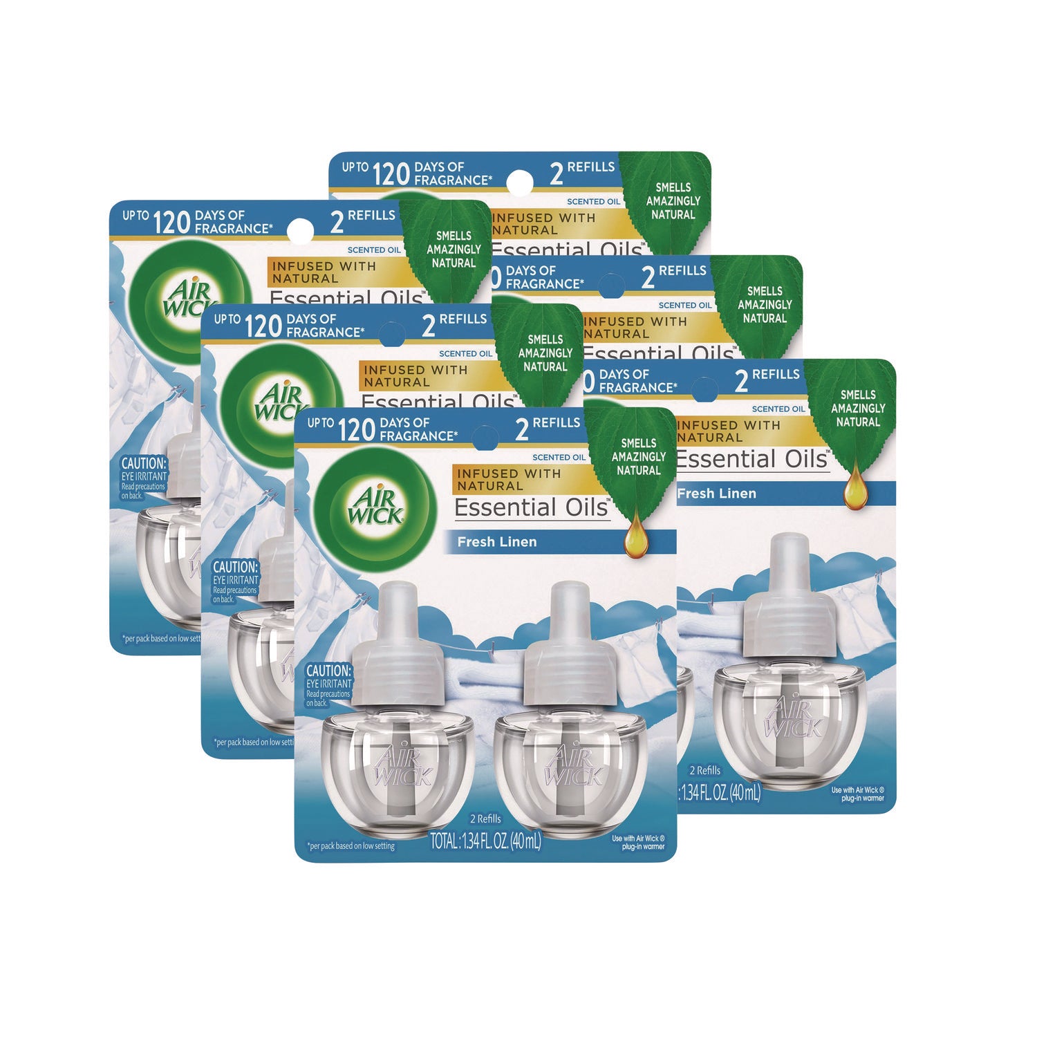 Leave a lasting impression on guests and ensure a consistent experience with Air Wick Scented Oil Refills with Essential Oils. Keep supply rooms stocked with the pleasant scents your guests come to associate with your business. Get up to 60 days per refill, on the lowest warmer setting, of natural-smelling fragrance with essential oil-infused formulas. Easily refill the Air Wick plug-in warmer by unscrewing the cap and inserting the refill until it clicks. Adjust the warmer settings to ensure the optimal fragrance for each room. Enhance entrances, common areas, offices, breakrooms and guest rooms with pleasant scents. Scent: Fresh Linen; Physical Form: Liquid; Application: Automatic Odor Control; Volume Capacity: 0.67 oz.