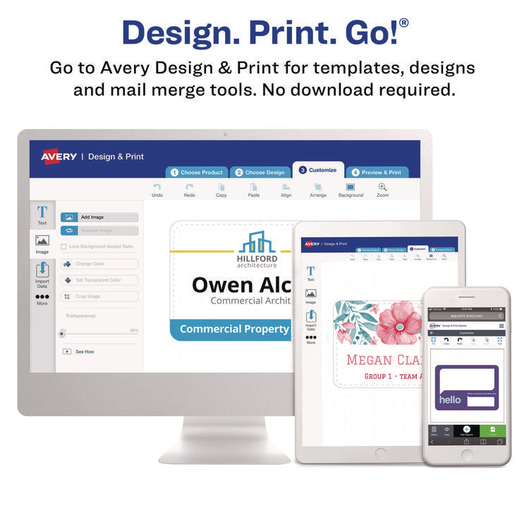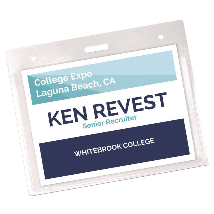 Secure design keeps badges from falling out. Heavyweight flexible plastic is ideal for permanent or temporary identification. Protect security access control cards or create name badges. Multi-use styles are pre-punched to accommodate lanyards and reel clips. Use with Avery® Name Badge Inserts (5390 and 5392). Easy to Customize with free templates and designs using Avery Design & Print online. Orientation: Horizontal; Name Badge Holder Length: 3"; Name Badge Holder Width: 4"; Name Badge Holder Color(s): Clear.