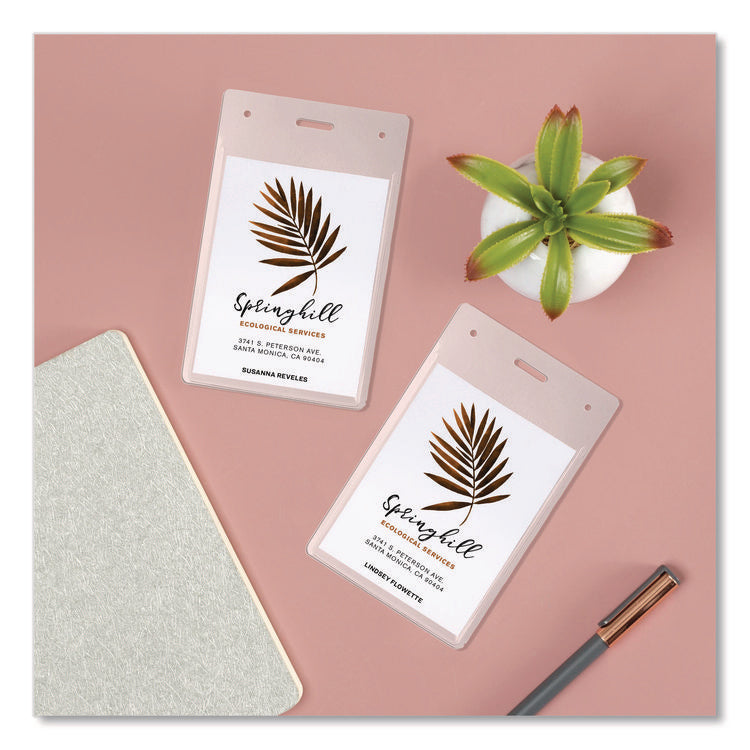Secure design keeps badges from falling out. Heavyweight flexible plastic is ideal for permanent or temporary identification. Protect security access control cards or create name badges. Multi-use styles are pre-punched to accommodate lanyards and reel clips. Use with Avery® Name Badge Inserts (5390 and 5392). Easy to Customize with free templates and designs using Avery Design & Print online. Orientation: Vertical; Name Badge Holder Length: 4"; Name Badge Holder Width: 3"; Name Badge Holder Color(s): Clear.
