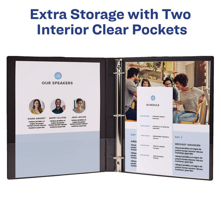 Keep your binder organization simple yet secure in a slim and convenient package with Avery Showcase View Binders with slant rings. The sturdy, lightweight construction ensures that the binder is up for light, general use and is perfect for school supplies, office supplies and more. Show off your class notes, employee handbooks and other important papers in a lower cost economy binder that provides a high-quality look and feel. Covered in a deep texture film that offers a smooth finish and linen-like pattern, these binders with clear covers work well at hiding surface damage from normal, everyday use. Each binder holds 8.5" x 11" paper, sheet protectors and dividers. The back-mounted slant rings keep your pages lying flat and easy to turn. Store loose sheets within the two interior pockets on the front and back covers of the binder. Personalize your binders and make the contents easy to identify at a glance with custom title pages for your front and back covers and matching ID label on the spine. Customizing your binder is easy when you use the designs and templates in Avery Design and Print. Great for use as a report binder, project binder, portfolio binder, presentation binder, recipe binder and more. Binder Type: Ring; Binder Style: View; Binder Size Capacity: 0.5"; Binder Sheet Capacity: 135.