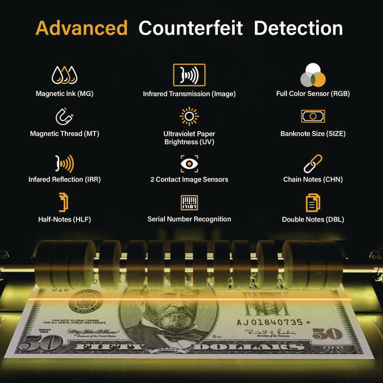 A two-pocket retail-ready solution for counting and sorting the cash your business generates. The Kolibri Signature™ will guarantee your cash counts are correct while vastly improving productivity. Unlike most money counters, the Signature™ is able to read a mixed stack of bills as it's fed through and automatically determine what denomination it is ($1, $2, $5, $10, $20, $50 and $100 bills). The two-pocket ensures that a suspect bill, incorrect denomination or face are sorted out into a reject pocket for non-stop counting or sorting. The Kolibri Signature includes a built-in printer, a wide variety of counting modes, a user-friendly interface and a large LCD display that provide a unique experience to speed through end-of-day settlements, till set-ups and more. Built to last and power through large amounts of cash quickly. Featuring three adjustable bill counting speeds of 800, 1,000 or 1,200 bills per minute provide flexibility based upon the state of the bills to be counted, slower speeds are great for worn bills while faster speeds will sail through crisp new bills. The extra-large hopper holds up to 500 bills at once. For high-performance currency counting and sorting, make Signature™ the one choice for your business. Cash/Coin Counter Type: Bill Counter; Denomination: Ones; Twos; Fives; Tens; Twenties; Fifties; Hundreds; Bill/Coin Capacity: 500; Counting/Sorting Speed: 1,200 Bills/min.