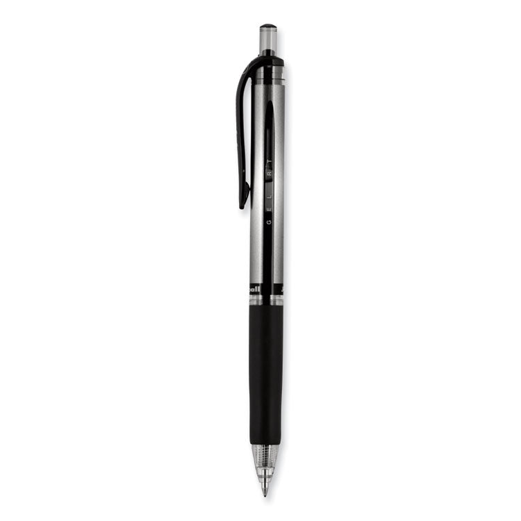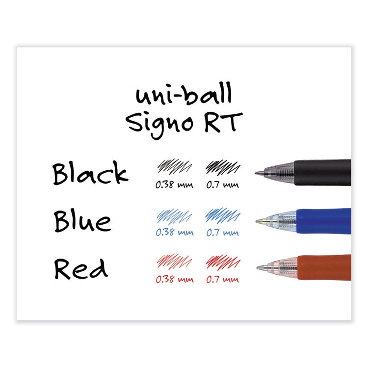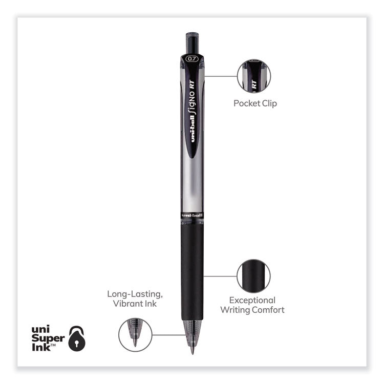 Create clear, crisp lines with Signo RT Retractable Gel Pens from uni-ball with a stainless steel tip that resists bending and breaking. Even-flowing, pigment-based gel ink delivers a smooth writing experience with long-lasting, vibrant color. Use these gel stick pens for everyday writing tasks, list making, note taking and check signing. Innovative uni Super Ink technology effectively entraps the gel ink into the paper, producing fraud, fade and water-resistant documents. A soft rubber grip helps you continue writing without fatigue while maintaining precision and detail throughout your tasks, while a translucent ink window indicates the level of gel ink remaining, so you don't run out unexpectedly. Pen Sub-Brand & Product Family: Signo; Pen Type: Gel Pen; Pen Style: Retractable; Pen Tip Type: Conical.