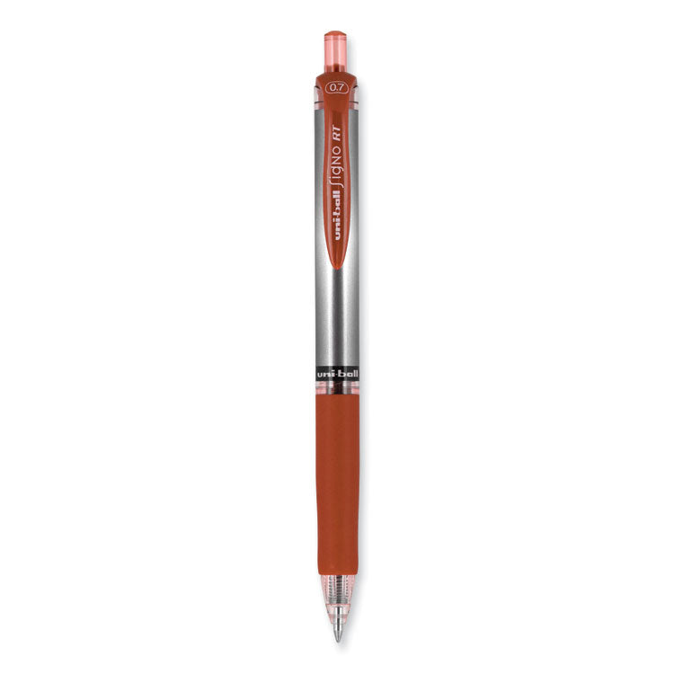 Create clear, crisp lines with Signo RT Retractable Gel Pens from uni-ball with a stainless steel tip that resists bending and breaking. Even-flowing, pigment-based gel ink delivers a smooth writing experience with long-lasting, vibrant color. Use these gel stick pens for everyday writing tasks, list making, note taking and check signing. Innovative uni Super Ink technology effectively entraps the gel ink into the paper, producing fraud, fade and water-resistant documents. A soft rubber grip helps you continue writing without fatigue while maintaining precision and detail throughout your tasks, while a translucent ink window indicates the level of gel ink remaining, so you don't run out unexpectedly. Pen Sub-Brand & Product Family: Signo; Pen Type: Gel Pen; Pen Style: Retractable; Pen Tip Type: Conical.