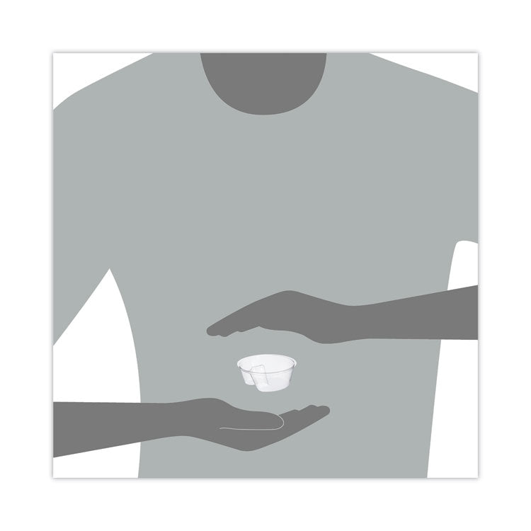 Pinch to lift, keeping hands clean and preventing product contamination. Provides a target for filling to practical ounce capacity. Maximizes product visibility. Cup Type: Portion Cup; Interior Volume Capacity: 3.5 oz; Material(s): Polyethylene Terephthalate (PET); Material Type: Plastic.