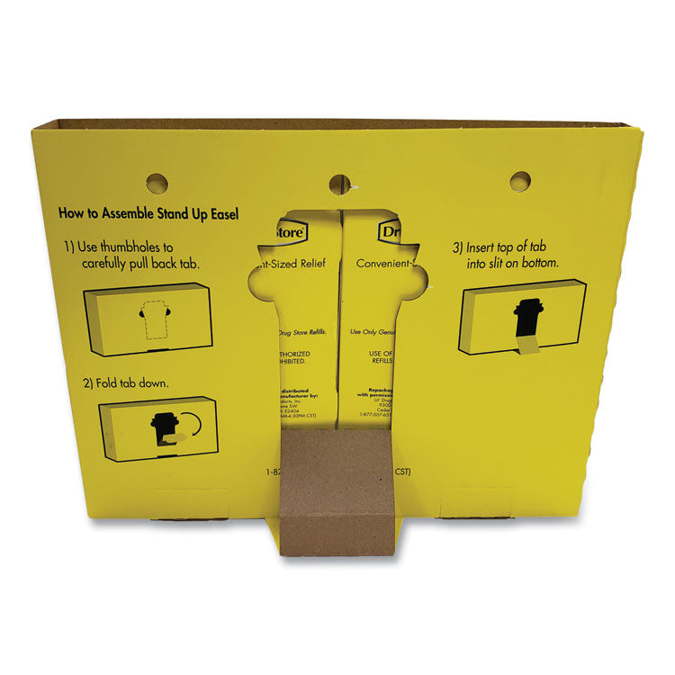 Improve productivity by keeping employees at their station when minor maladies occur. Mounts on a wall or back of a door with two screws or picture hangers (not included). Keep primary OTC medicines handy. Medicine dispenser comes with four medicines. Refill with any medicine refill. 135 Pieces—Includes 30 doses each of Advil®, Aleve®, Tylenol® Extra-Strength and 15 doses of Alka-Seltzer. Product Displayed: Advil; Aleve; Alka Seltzer; Tylenol Extra Strength; Height: 10.75"; Depth: 2.25"; Width: 15.5".