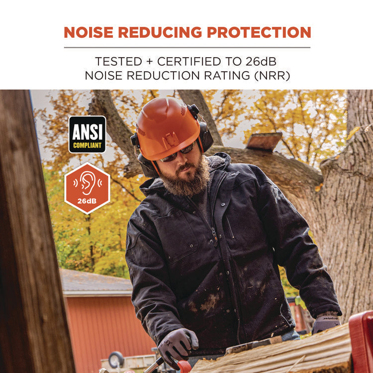 The Skullerz 8880 Hard Hat Mounted Earmuffs are designed for comfort and noise reduction both on and off the job site. These noise-canceling earmuffs seamlessly integrate into Skullerz Hard Hat and Safety Helmet dedicated side accessory mounting slots for a secure fit. The earcups are designed for all-day, comfortable wear and are also adjustable and can be tilted up, down or stored onto the side of the hard hat or safety helmet to create a customized fit. The earmuff's ABS outer construction is durable for long-lasting protection in tough environments and the polished stainless steel wire arms offer smooth adjustment and increase longevity of the earmuffs. Cap-Style. Material(s): ABS; Foam; Stainless Steel; Ear Cushion Material: Foam; Noise Reduction Rate (NRR): 26 dB; For Use With: Skullerz Cap-Style Hard Hats, Face Shields, Safety Helmets.