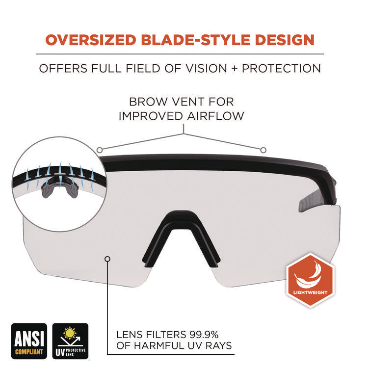 Skullerz AEGIR Anti-Scratch and Enhanced Anti-Fog Safety Glasses feature an oversized blade-style design to provide superior eye protection and maximized field of vision. These protective safety glasses feature tough scratch-resistant and anti-fog polycarbonate lenses to protect against impacts and filter 99.9 percent of harmful UVA, UVB and UVC rays. The high-strength frame is built for durability and the rubberized nose bridge and temples offer non-slip security and resist sweat for all-day comfort. To provide a custom fit, the rubber temples can be easily bent and re-bent to accommodate a variety of head shapes and fit preferences. Impact resistant. Safety Glasses Style: Wraparound; Frame Color: Matte Black; Frame Material: Nylon Impact; Lens Material: Polycarbonate.