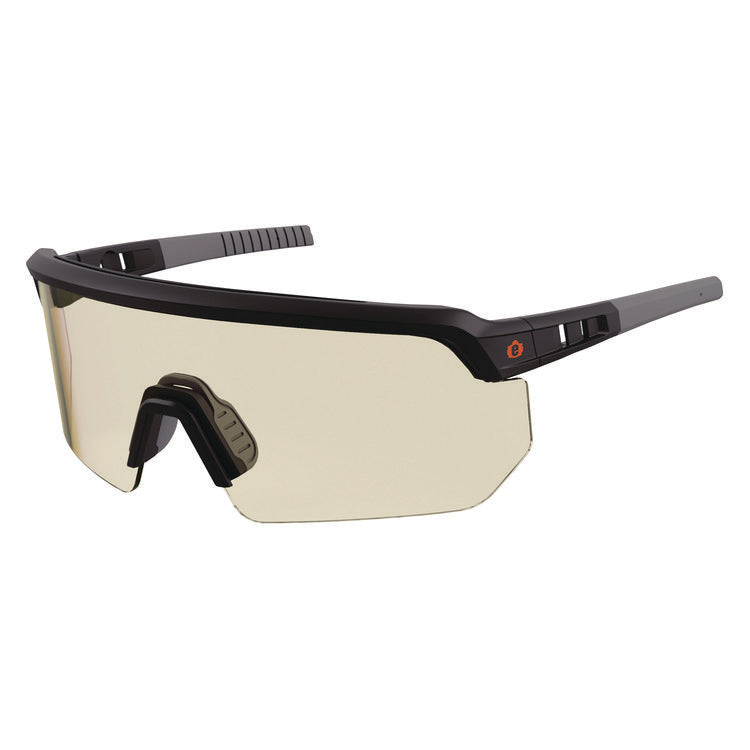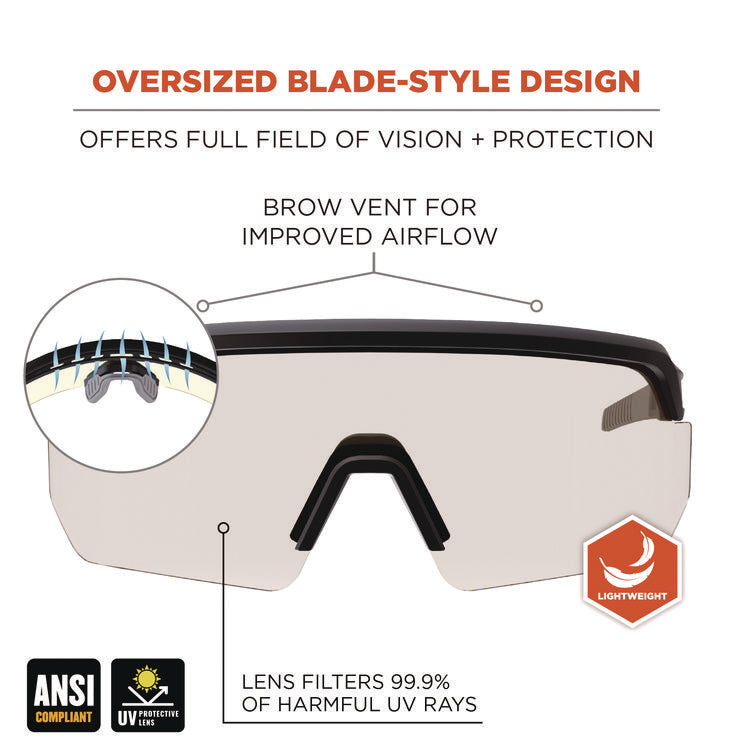 Skullerz AEGIR Anti-Scratch and Enhanced Anti-Fog Safety Glasses feature an oversized blade-style design to provide superior eye protection and maximized field of vision. These protective safety glasses feature tough scratch-resistant and anti-fog polycarbonate lenses to protect against impacts and filter 99.9 percent of harmful UVA, UVB and UVC rays. The high-strength frame is built for durability and the rubberized nose bridge and temples offer non-slip security and resist sweat for all-day comfort. To provide a custom fit, the rubber temples can be easily bent and re-bent to accommodate a variety of head shapes and fit preferences. Impact resistant. Safety Glasses Style: Wraparound; Frame Color: Matte Black; Frame Material: Nylon Impact; Lens Material: Polycarbonate.