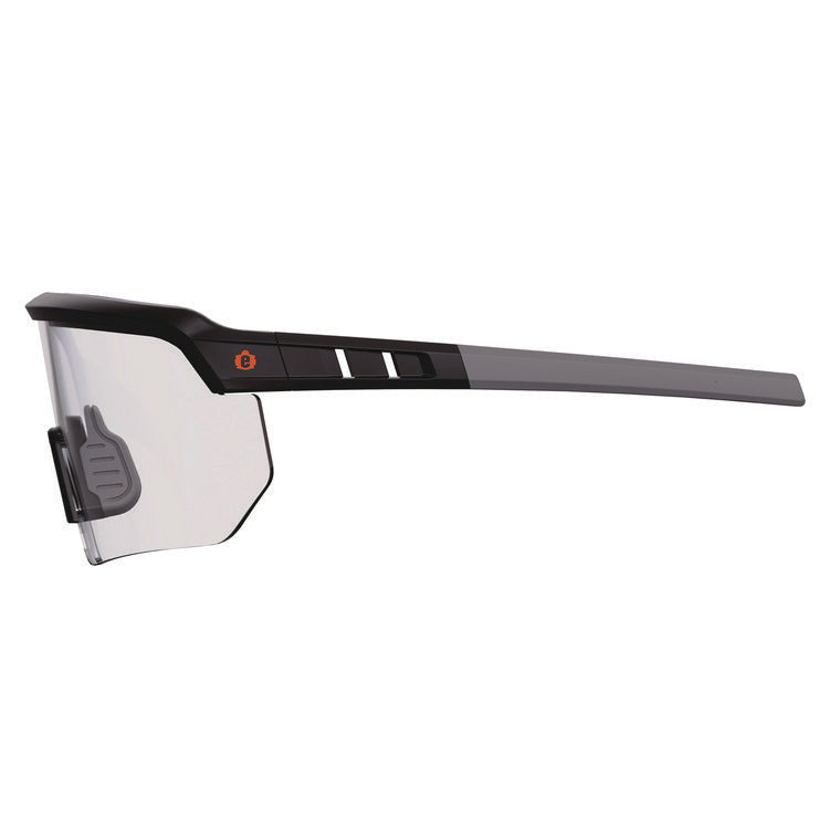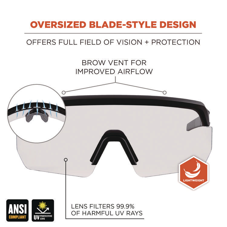 Skullerz AEGIR Safety Glasses feature an oversized blade-style design to provide superior eye protection and maximized field of vision. These protective safety glasses feature polycarbonate lenses to protect against impacts and filter 99.9 percent of harmful UVA, UVB and UVC rays. The high-strength frame is built for durability and the rubberized nose bridge and temples offer non-slip security and resist sweat for all-day comfort. To provide a custom fit, the rubber temples can be easily bent and re-bent to accommodate a variety of head shapes and fit preferences. Impact resistant. Great for protecting your eyes during outdoor work like construction and landscaping as well as carpentry and woodworking. Safety Glasses Style: Wraparound; Frame Color: Matte Black; Frame Material: Nylon Impact; Lens Material: Polycarbonate.