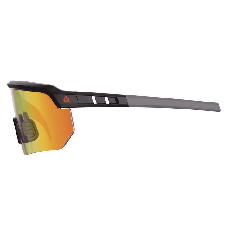 The Skullerz AEGIR Safety Glasses feature an oversized blade-style design to provide superior eye protection and maximized field of vision. These protective safety glasses feature polycarbonate lenses to protect against impacts and filter 99.9 percent of harmful UVA, UVB and UVC rays. The high-strength frame is built for durability and the rubberized nose bridge and temples offer non-slip security and resist sweat for all-day comfort. To provide a custom fit, the rubber temples can be easily bent and re-bent to accommodate a variety of head shapes and fit preferences. Impact resistant. Safety Glasses Style: Wraparound; Frame Color: Matte Black; Frame Material: Nylon Impact; Lens Material: Polycarbonate.