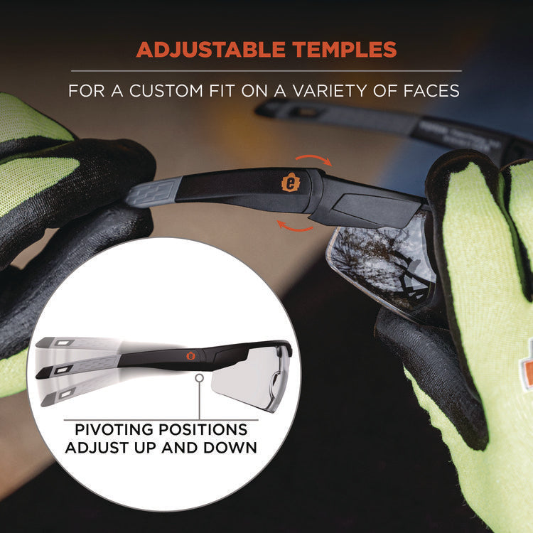Skullerz DELLENGER Safety Glasses feature adjustable temples that shift up or down and lock into place for a custom fit on a variety of face sizes. These safety glasses feature polycarbonate lenses to protect against impacts and filter 99.9 percent of harmful UVA, UVB and UVC rays. The rimless design makes for a lightweight and comfortable fit and provides a full field of vision. The integrated, contoured nose bridge won't slip or pinch and the flex-fit temples reduce pressure and provide stay-put all-day comfort. These UV protection glasses are great for protecting your eyes during indoor and outdoor work like construction, carpentry/woodworking, demolition or landscaping. Also great for outdoor hobbies like boating, skiing and fishing. Safety Glasses Style: Half-Frame Wraparound; Frame Color: Matte Black; Frame Material: Nylon Impact; Lens Material: Polycarbonate.