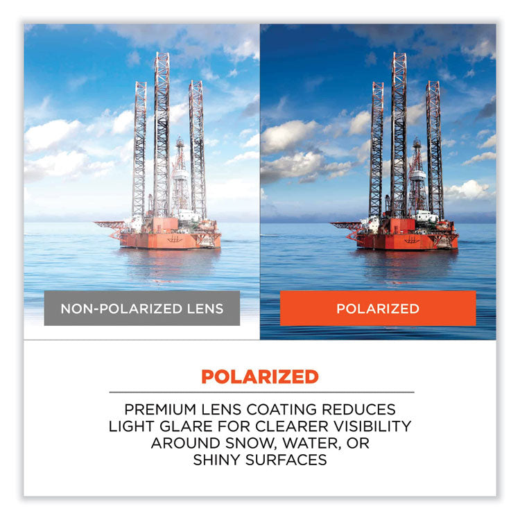 The Skullerz® Odin Safety Glasses take their name from the king of the Norse Gods. These full-frame, protective work safety sunglasses feature tough scratch-resistant lenses filter 99.9 percent of harmful UVA, UVB and UVC rays to keep your eyes safe in the sun. The durable frames bend and flex without breaking. A non-slip rubber nose piece and rubber temples keep the glasses secure and resist sweat. An elastic retainer strap or foam gasket insert can be attached to the temples. They offer high-velocity impact protection and ballistic fragmentation protection, which is the U.S. Military Combat Eye Protection System Performance Specification for eyewear. Polarized—Reduce glare and eye fatigue around water, snow and in other bright environments. Safety Glasses Style: Wraparound; Frame Color: Black; Frame Material: Nylon Impact; Lens Material: Polycarbonate.