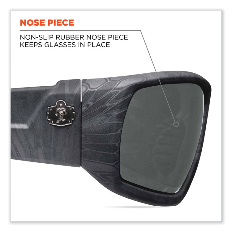 The Skullerz® Odin Safety Glasses take their name from the king of the Norse Gods. These full-frame, protective work safety sunglasses feature tough scratch-resistant lenses filter 99.9 percent of harmful UVA, UVB and UVC rays to keep your eyes safe in the sun. The durable frames bend and flex without breaking. A non-slip rubber nose piece and rubber temples keep the glasses secure and resist sweat. An elastic retainer strap or foam gasket insert can be attached to the temples. They offer high-velocity impact protection and ballistic fragmentation protection, which is the U.S. Military Combat Eye Protection System Performance Specification for eyewear. Polarized—Reduce glare and eye fatigue around water, snow and in other bright environments. Safety Glasses Style: Wraparound; Frame Color: Kryptek Typhon; Frame Material: Nylon Impact; Lens Material: Polycarbonate.