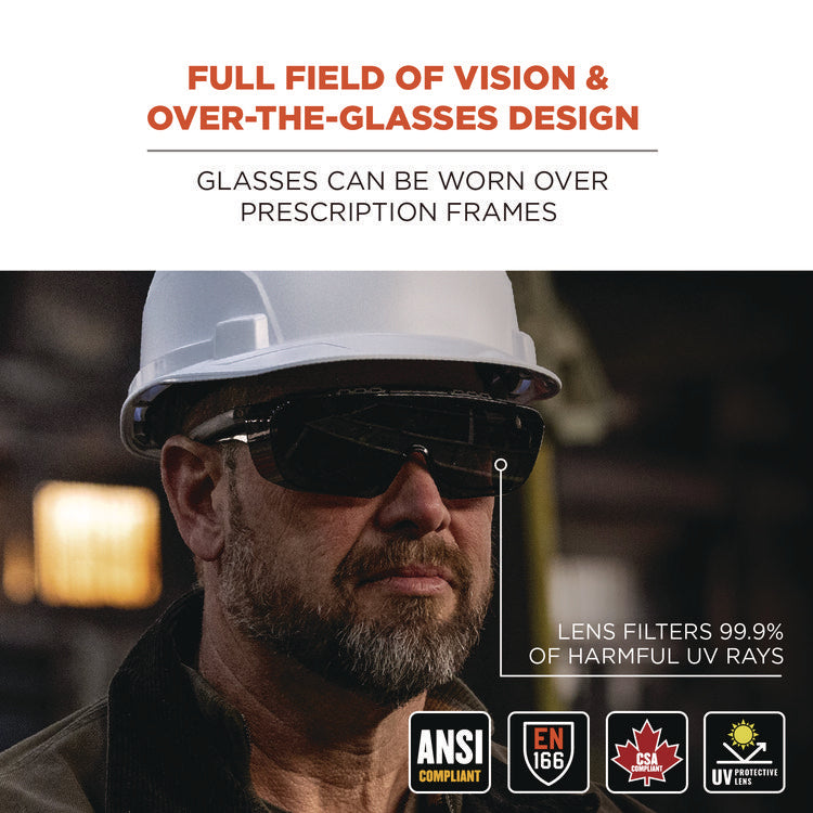 Skullerz OSMIN Anti-Scratch and Enhanced Anti-Fog Safety Glasses feature an Over-the-Glasses (OTG) wraparound lens for a wide field of vision and seamless fit over prescription frames. These safety glasses feature tough anti-scratch and anti-fog polycarbonate lenses to protect against impacts and filter 99.9 percent of harmful UVA, UVB and UVC rays. The frame features a nylon and soft rubber design for added durability and flexibility, while a molded-in brow guard and side shields provide enhanced protection from debris. Integrated brow venting enables airflow for improved anti-fog performance. To provide a custom, secure fit on a variety of faces, the rubber temples can be easily bent and re-bent. Built-in soft rubber guards on the frame and temples protect prescription frames and lenses from constant movement and harmful scratching that can occur with some over-the-glasses safety glasses. Safety Glasses Style: Over-the-Glasses; Frame Color: Matte Black; Frame Material: Polycarbonate; Lens Material: Polycarbonate.