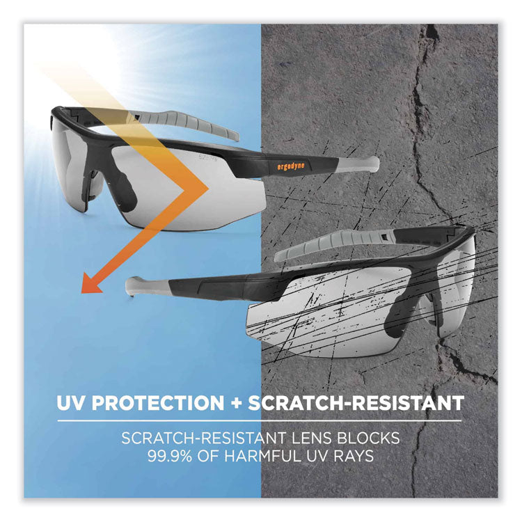 The Skullerz® Skoll Safety Glasses are named after the Norse Wolf God of Sun and Moon. These protective work safety sunglasses feature tough scratch-resistant lenses filter 99.9 percent of harmful UVA, UVB and UVC rays to keep your eyes safe in the sun. The blade-style design is a sleek and sporty look with all the features you've come to expect from Skullerz® Eye Protection at an outstanding value. The durable frames bend and flex without breaking. Flexible rubber temples and non-slip nose piece offer a non-slip, comfortable fit. These impact-resistant safety glasses also offer high velocity protection. Safety Glasses Style: Single Lens; Frame Color: Matte Black; Frame Material: Nylon Impact; Lens Material: Polycarbonate.