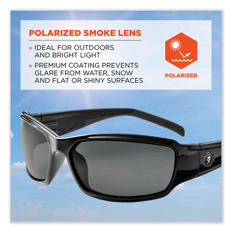 The Skullerz® Thor Safety Glasses look great both on and off the job. These full-frame protective work safety sunglasses feature tough scratch-resistant lenses that filter 99.9 percent of harmful UVA, UVB and UVC rays to keep your eyes safe in the sun. The durable frames bend and flex without breaking. A non-slip rubber nose piece and rubber temples keep the glasses secure and resist sweat. These impact-resistant safety glasses are tested to ANSI Z87.1+ High-Velocity Impact Protection and optical requirements. Also tested to MIL-PRF-32432 Ballistic Fragmentation, Class 1, which is the US Military Combat Eye Protection System Performance Specification for eyewear. Polarized—Reduce glare and eye fatigue around water, snow and in other bright environments. Safety Glasses Style: Wraparound; Frame Color: Black; Frame Material: Nylon Impact; Lens Material: Polycarbonate.