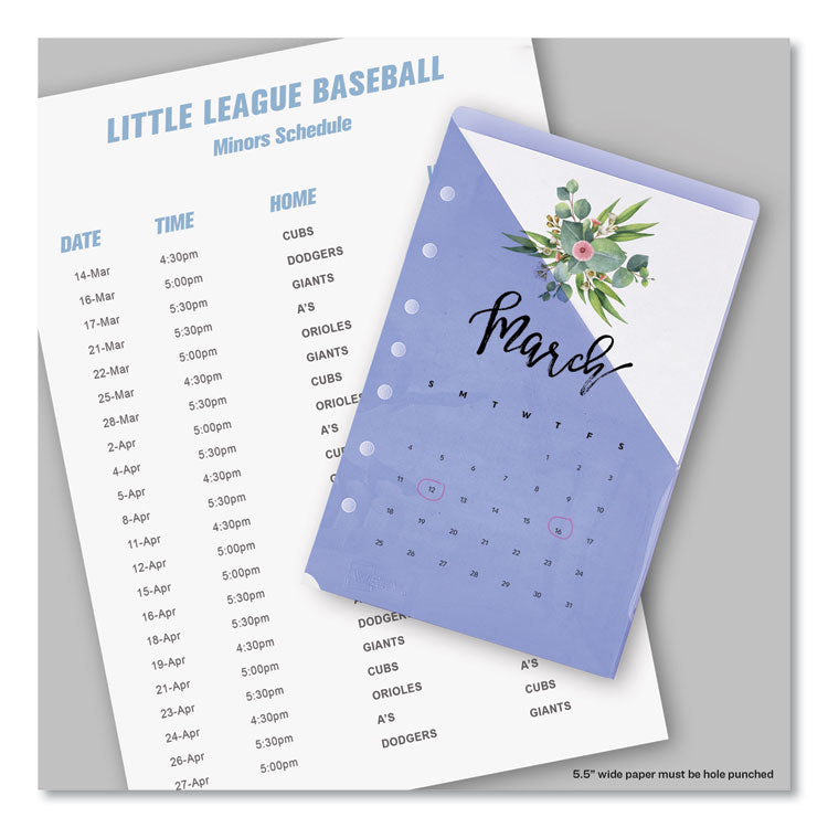 Durable, see-through pockets keep small-format binders neatly organized. Ideal for long-term storage, non-stick polypropylene material is acid-free and won't lift print. Each pocket holds up to 20 insert sheets. Seven-hole punched for use with small format binders and organizers. Standard Binder Pockets—Holds 5.5 x 8.5 size documents. Color(s): Assorted; Height: 5.5"; Width: 9.25"; Color Assortment: Blue; Green; Orange; Purple; Yellow.