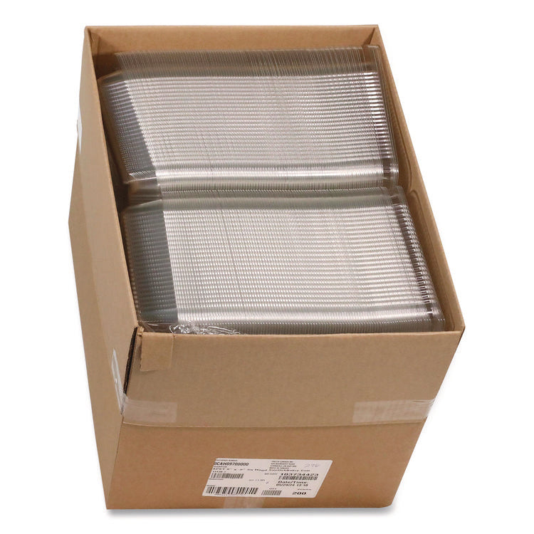 Enhance your packaging with the clarity and distinction of PET bakery containers. Our packaging effortlessly combines style and functionality to meet all your food packaging needs effectively. Made from strong PET material with a wide temperature resilience range (-20°F to 120°F) enables placement in freezers and heated display cases. Crystal clear packaging to optimize merchandising of baked goods. Great for merchandising bakery items, cheeses, produce, sandwiches, and more. SmartLock® system features a tight, audible click closure that helps ensure maximum food freshness. Smooth front panel makes sticker-labeling easy. Strong, rib-reinforced sides and back accommodate heavy items and provide enhanced crush resistance. Break-resistant hinge is flexible enough for easy closure and reliable enough for repeated openings and closings. Food Container Type: Hinged Lid Container; Material(s): PET - Polyethylene Terephthalate; Material Type: Plastic; Color(s): Clear.