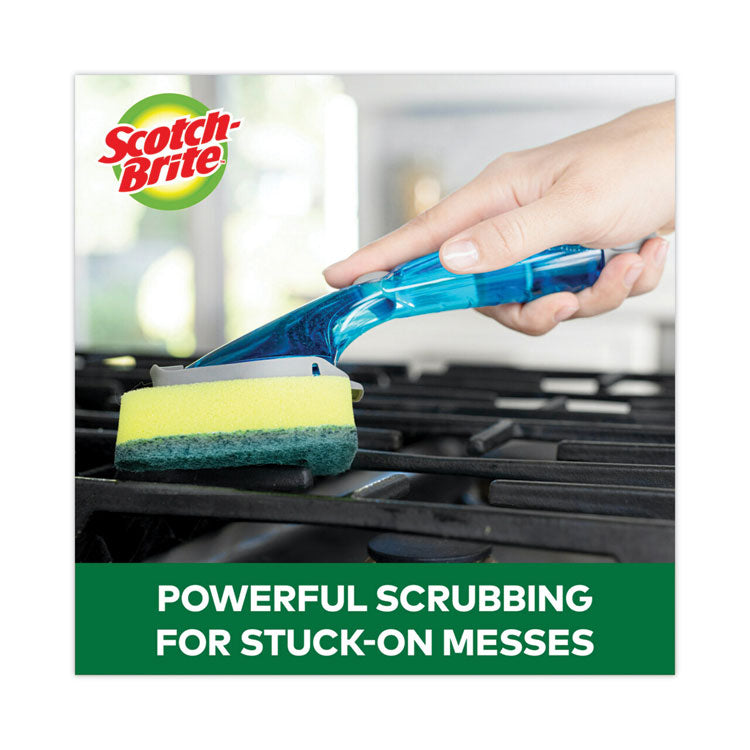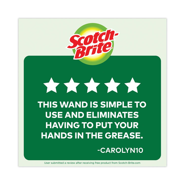 Heavy-duty dishwand keeps hands out of the mess! Tough scrubbing head tackles your pots and pans. Teardrop-shaped scouring pad gets into corners, nooks and crannies. Simply replace the head when it's worn out. Replacement sponge heads sold separately. Scouring Pads/Sticks Type: Dishwand; Material(s): Plastic; Synthetic Fiber; Urethane; Size (W x L): 2.5" x 9.5"; Color(s): Yellow/Green.