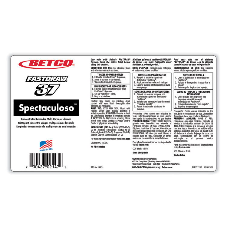 This all-purpose cleaner concentrate cleans and deodorizes most water-washable surfaces. Rinse-free, effective in hard water and will suspend the toughest soils. Spectaculoso can be applied in an auto scrubber, mop and bucket, or with a spray or sponge. Application: All-Purpose; Applicable Material: Ceramics; Enamel; Fiberglass; Finished/Sealed Wood; Glass; Laminates; Plastic; Chemical Compound: C9-11 Alcohols Ethoxylated; Butoxydiglycol; Sodium Laureth Sulfate; Tetrasodium EDTA; Scent: Lavender.
